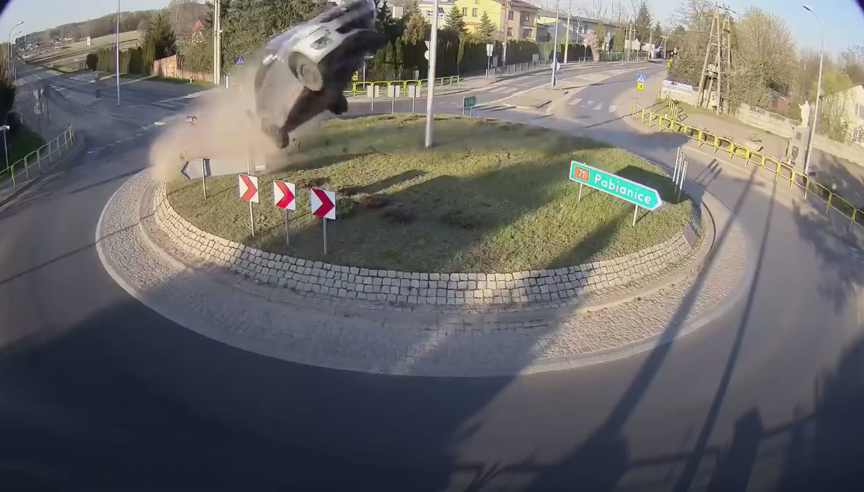 Een 41-jarige Pool heeft afgelopen zondag zijn kleine Suzuki hard gelanceerd over een rotonde bij het plaatsje Rąbień. Hij ramde de verhoogde rotonde vol gas en maakte daarbij een indrukwekkende vlucht.