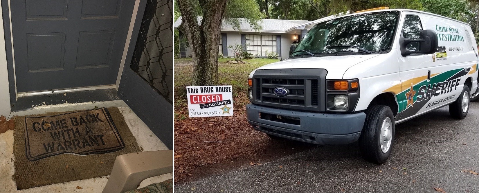 De politie in het Amerikaanse Palm Coast regelde een huiszoekingsbevel voor een inval bij een man die 'Come back with a warrant' op zijn deurmat heeft staan. In het huis vonden agenten drugs.