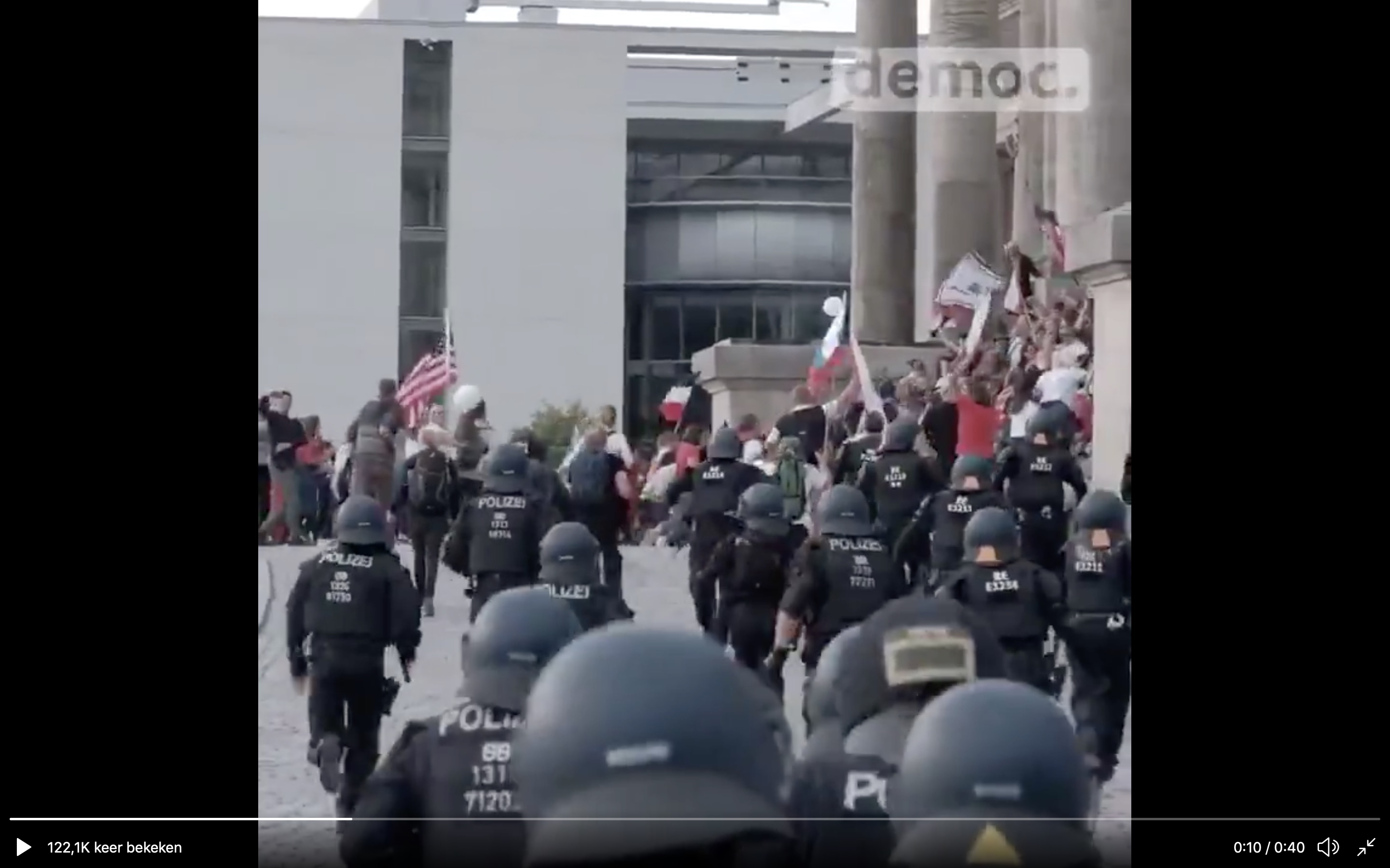 Een honderdtal demonstranten heeft de politie voor het parlementsgebouw - niet meer dan vier agenten - overvallen en geprobeerd het gebouw binnen te komen. Een deel van hen zwaaide met de vlag van het oude Duitse Rijk van voor de tweede wereldoorlog, een symbool van de Reichsbürger, een extreemrechtse groepering dat volhoudt dat het oude Reich nog bestaat en bezet wordt door de geallieerden.