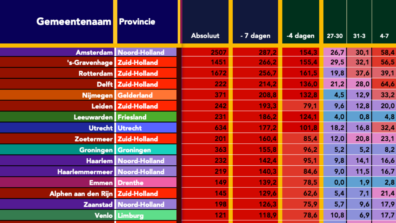 Per hoofd van de bevolking is het Brabantse Reusel-De Mierden in de voorbije week de felste coronahaard. Van de grote steden is nog altijd Amsterdam het zwaarst getroffen. Hier kwamen er in een week tijd meer dan 2.500 nieuwe besmettingen bij.