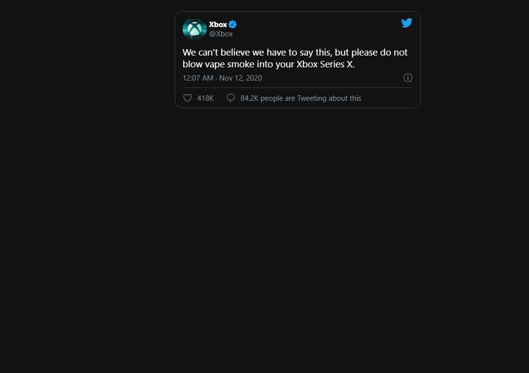 Twee dagen na de release van de Xbox Series X ziet Microsoft al noodzaak om gamers op te roepen om geen vape rook in hun Xbox te blazen. Vlak na de release verschenen er video's op sociale media van rokende Xboxes. De consoles zouden oververhit raken, waardoor er rook uit de ventilatieopeningen aan de bovenkant kwam.