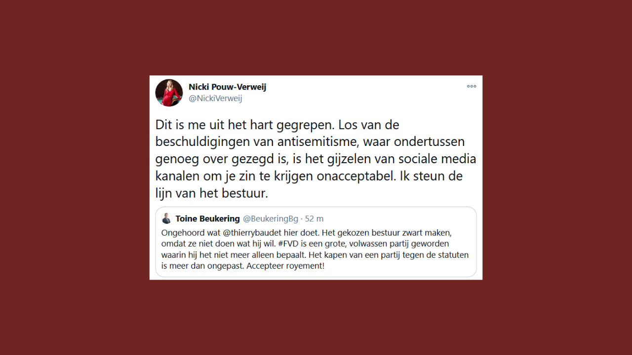 Nadat gisteren Annabel Nanninga het vertrek van Thierry Baudet eistte en vandaag het Forum-bestuur de voormalig leider buitenspel heeft gezet, doet ook nummer drie van de lijst Nicki Pouw-Verweij een duit in het zakje. Op Twitter schrijft Verweij dat het gijzelen van sociale media kanalen onacceptabel is, en dat zij de lijn van het bestuur steunt.