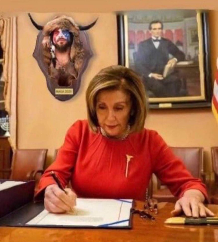 “Chansley is geïdentificeerd als de vermeende man die in de mediaverslaggeving te zien was als degene die het Capitool betrad met hoorns op zijn hoofd, een lange muts van berenvel, rood, wit, blauwe gezichtsverf, zonder shirt en in een bruine broek. Deze persoon droeg een speer van ongeveer 1.80 meter lang, met een Amerikaanse vlag vlak onder het lemmet gebonden.”