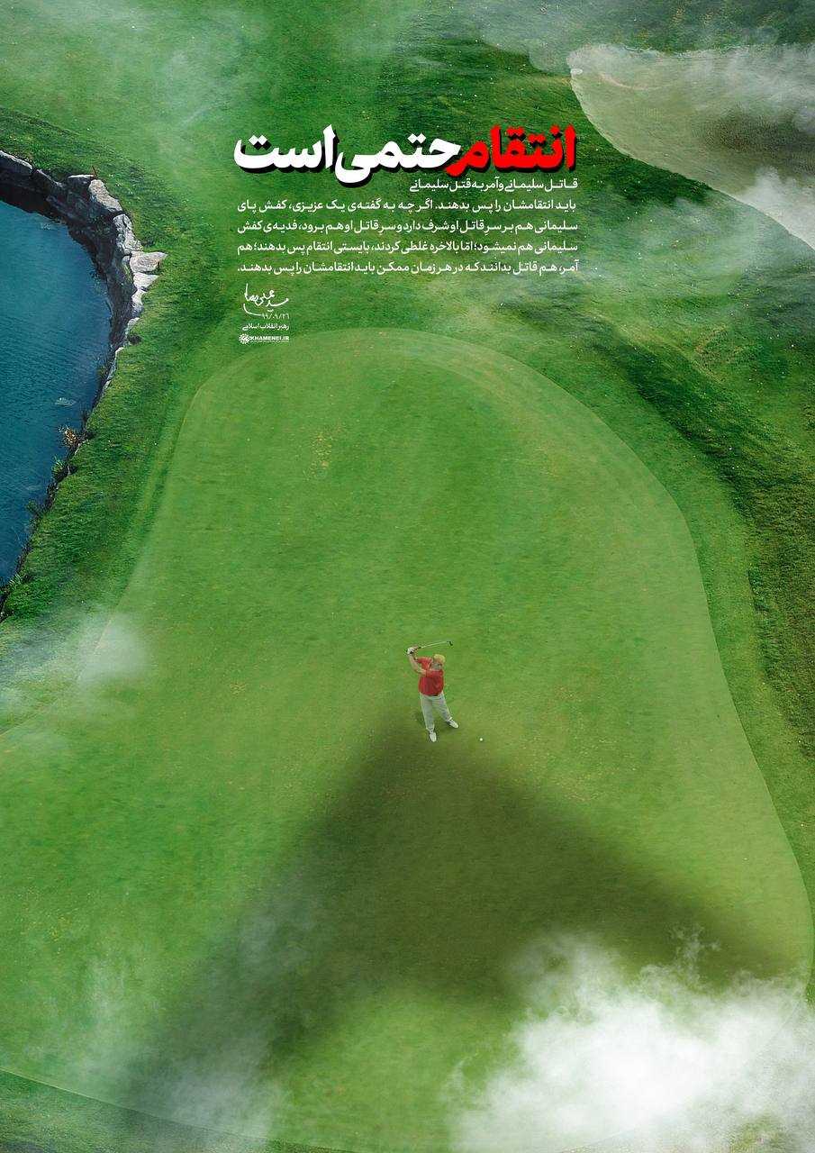 De grote leider van het altijd zonnige Iran heeft vrijdag via twitter wraak gezworen tegen de moordenaar van generaal Soleimani. Ayatollah Khameini deed dat middels een tweet met een plaatje van een golfer. De golfer wordt daarbij vanuit droneperspectief in beeld gebracht. Er is weinig verbeelding nodig om daar president Trump in te zien.