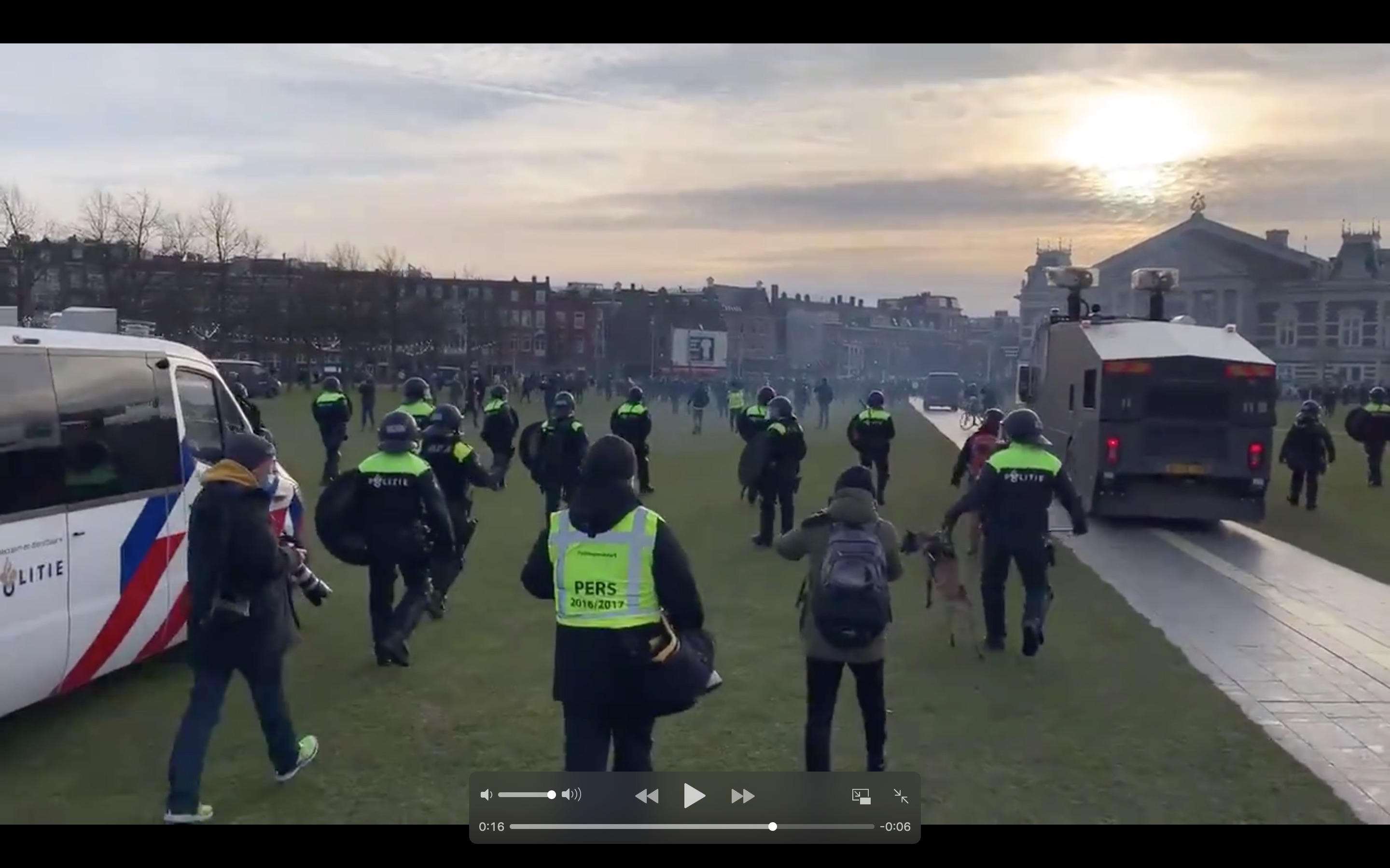 De Amsterdamse driehoek heeft een noodbevel afgekondigd voor de omgeving van het Museumplein. Een groep demonstranten tegen de coronamaatregelen, verzameld onder het mom van het drinken van een kopje koffie, weigerde te vertrekken. Na een paar uur waarschuwingen omgeroepen te hebben heeft een grote stoet van Mobiele Eenheid (ME) en politie, ondersteund door een vloot busjes, paarden en een waterkanon, het plein relatief snel schoon weten te vegen.