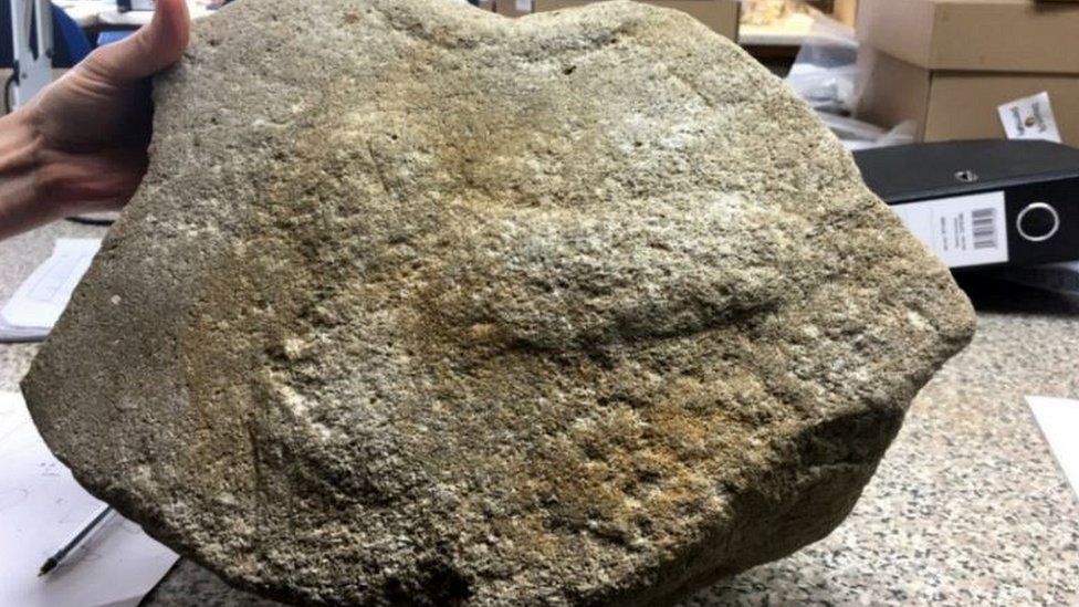 Het kunstwerk werd aangetroffen op een gebroken molensteen die rond 2018 werd opgegraven bij de verbreding van de Britse A14. Archeologen hebben de steen recentelijk gerepareerd, waarop de phallusvormige afbeelding tevoorschijn kwam.