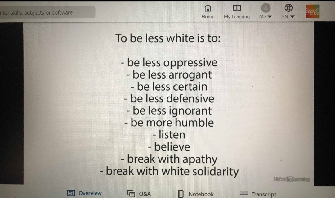 Coca-Cola ligt onder vuur nadat er beelden van een presentatie op het LinkedIn Learning-platform van het bedrijf zijn uitgelekt. In de presentatie worden werknemers opgeroepen om "minder wit" te zijn. Dat houdt onder meer in dat ze minder onderdrukkend, minder arrogant en minder onwetend moeten zijn.