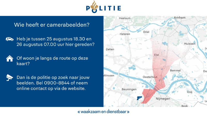 De man was neergeschoten en de schutter is nog voortvluchtig. De politie is daarom op zoek naar mensen die camerabeelden hebben gemaakt rond de Scherpenkampweg, bij voorkeur op 25 augustus tussen 18.30 en de volgend ochtend 07.00 uur. TGO vraagt daarbij ook om dashcambeelden van bestuurders die in de omgeving van het voormalige zorgcomplex Kinderdorp Neerbosch reden rond die tijd.