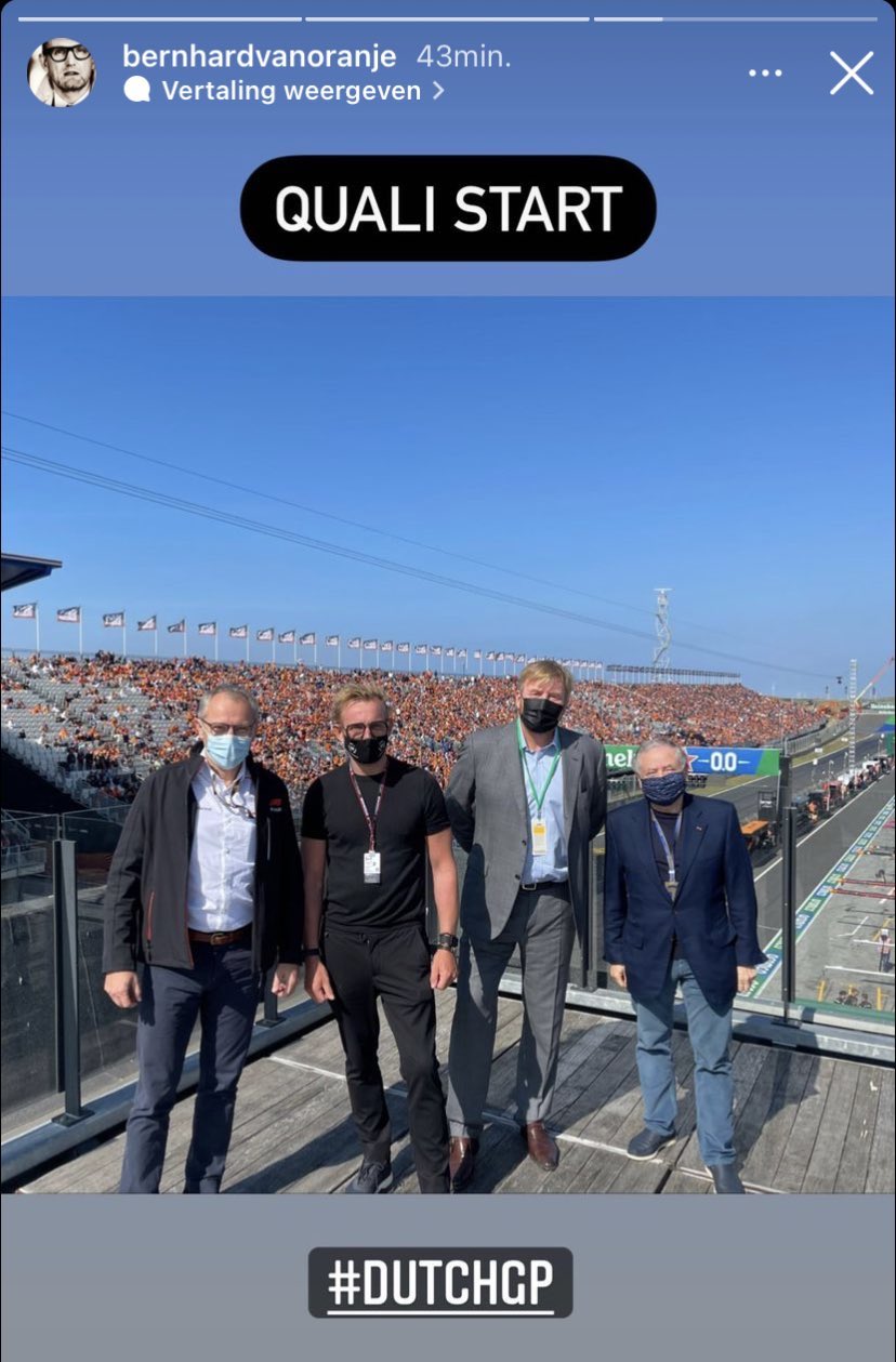 Willem-Alexander heeft niet gewacht op de race, maar is op zaterdagmiddag ook al bij de kwalificatie van de F1 gesignaleerd. Zijn neef, prins Bernhard Jr., heeft een foto op zijn Instagram gedeeld.