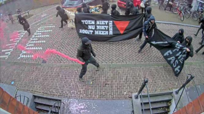 Op videobeelden is te zien hoe een kleine optocht van spandoek dragende, in het zwart gekleden en zichzelf "antifascisten" noemende lieden met verf en vuurwerk naar het portiek van het pand op de Amsterdamse Herengracht gooien. Achter de stoet lopen enkele agenten, die niet ingrijpen maar wel foto's maken van de schade.