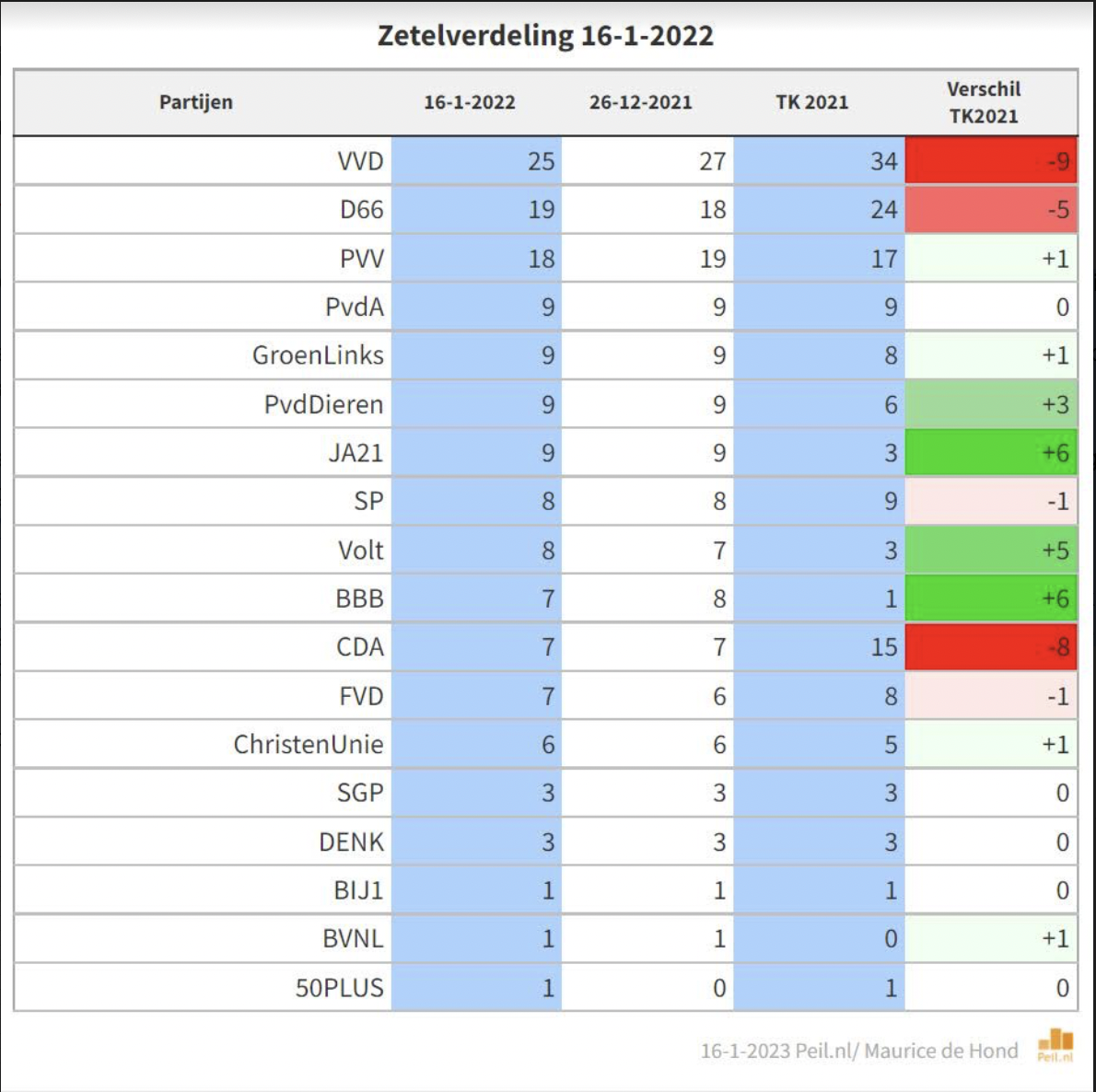 De VVD staat op negen zetels verlies ten opzichte van de verkiezingen in maart vorig jaar en komt volgens Maurice de Hond op 25 uit vandaag. Dat zijn er twee minder dan bij de laatste peiling van 26 december 2021. De Hond signaleert sinds december dat de partij van Mark Rutte langzaam weg glijdt.