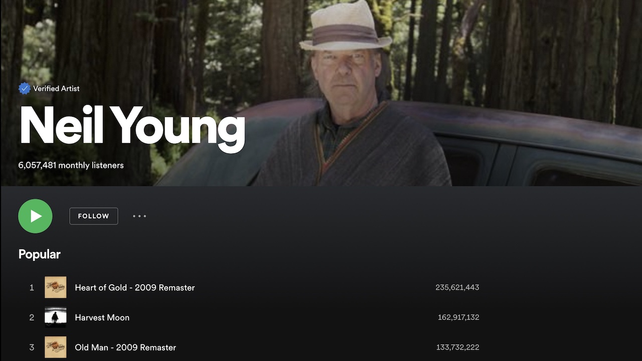 Ouwe rocker Young verlangt snelle actie, zo maken we op uit zijn brief: “Handel hier alsjeblieft onmiddellijk naar vandaag en hou me op de hoogte van het tijdspad." Op moment van schrijven zijn evergreens als Heart of Gold, Rockin' in the Free World en Old Man nog gewoon te beluisteren bij de streamingdienst.