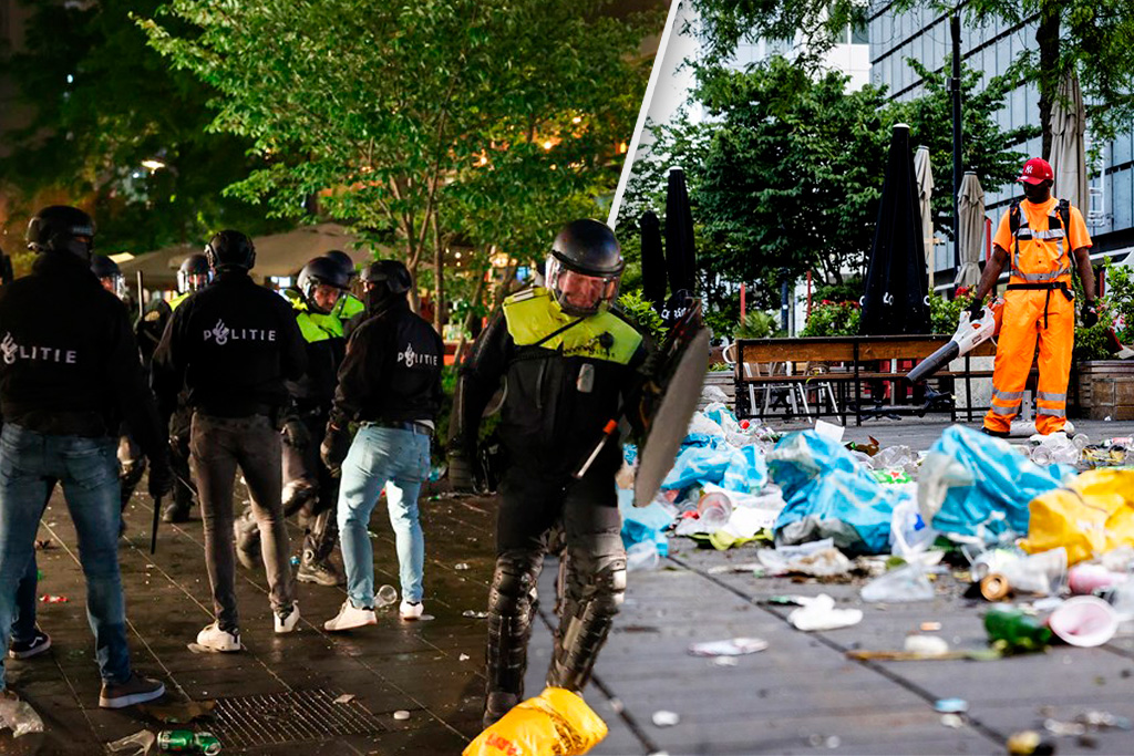 Naast de tientallen aanhoudingen leverde de voetbalwedstrijd ook een hoop rotzooi op. Gemeentelijke schoonmaakploegen stonden vanochtend voor dag en dauw de stad weer aan kant te maken. ''Als Nederland de slaapmuts afdoet denken ze: is er wel een feestje geweest op Zuid rond De Kuip?'', aldus een enthousiaste reinigings-teamleider.