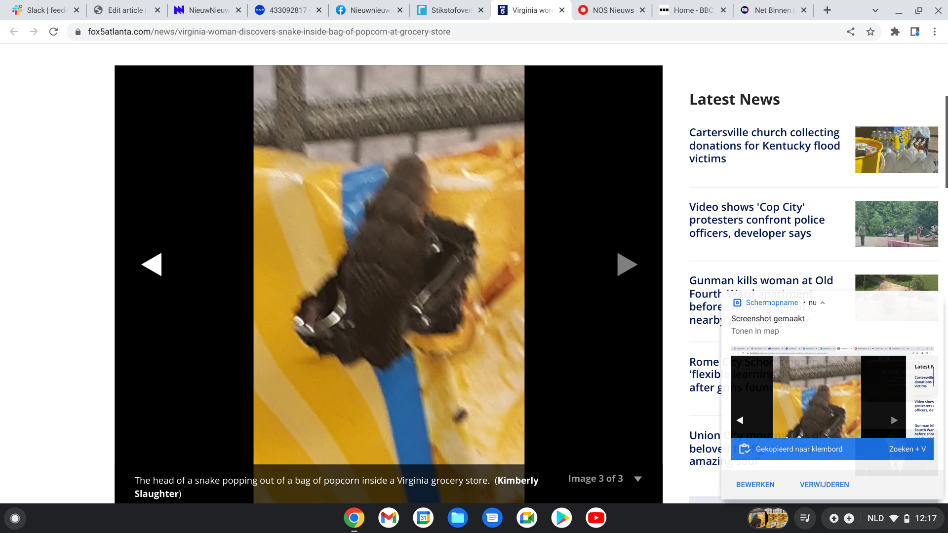 "Hij kroop er ineens uit, alsof hij even hallo kwam zeggen vertelt de vrouw aan Fox 5 Virginia. In de zak had zich namelijk een grote slang verscholen. "Hij was zo groot als het winkelkarretje", aldus de vrouw.