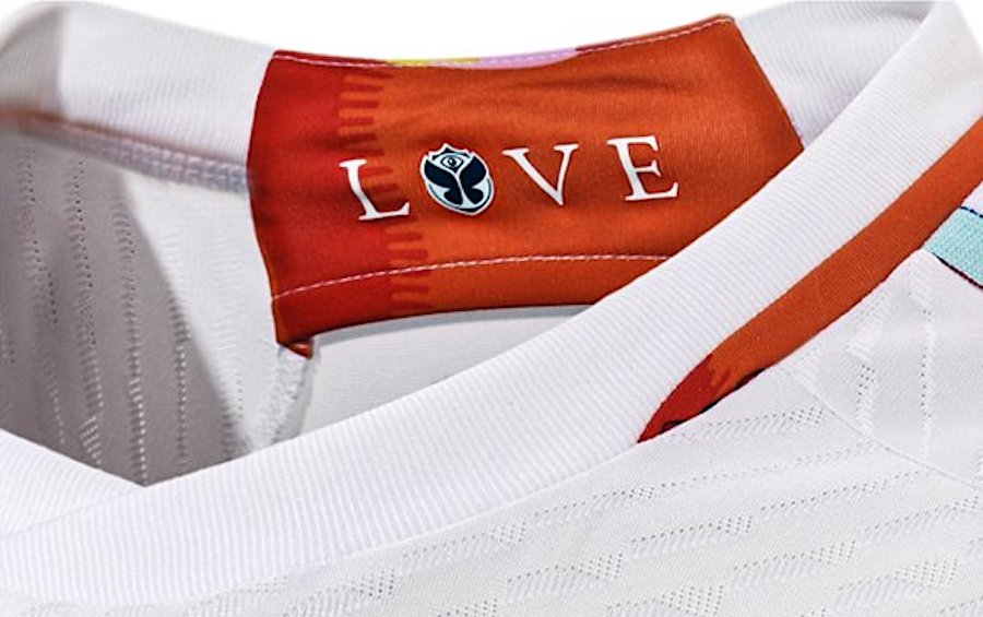 Aan de binnenkant van het uitshirt staat in de nek het woord 'LOVE' en daar is de FIFA niet gelukkig mee. België mag alleen met het shirt spelen als dat woord met een sticker is afgeplakt. Het woordje is een verwijzing naar Tomorrowland, het festival dat meewerkte aan het ontwerp van de tenues en dat mag niet volgens de reclameregels van de FIFA.
