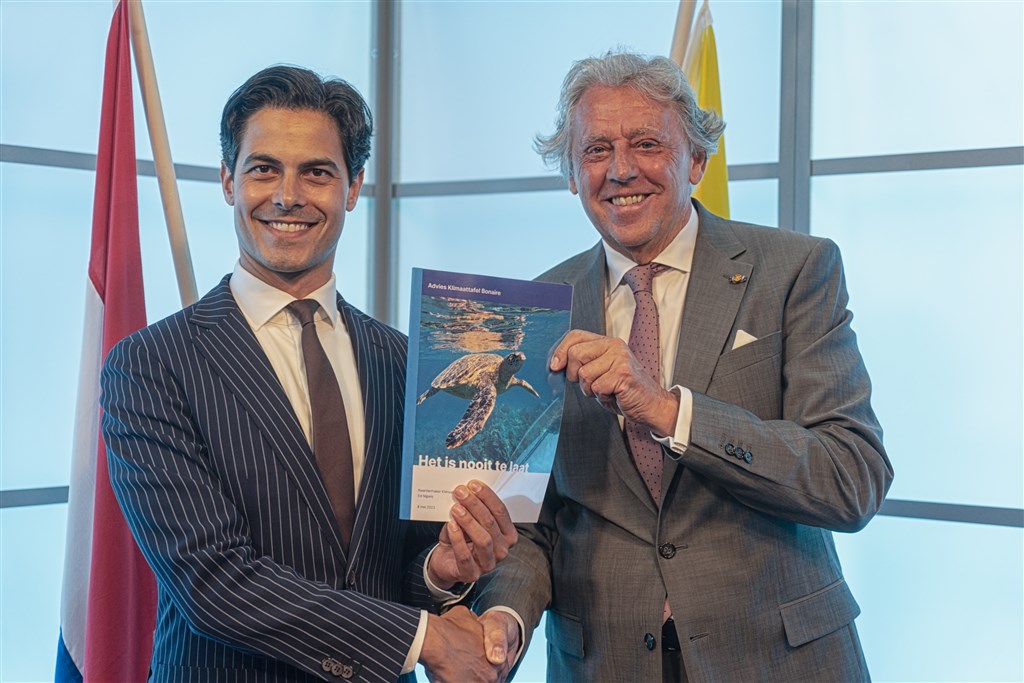 "KRALENDIJK - Kwartiermaker op Bonaire Ed Nijpels (R), overhandigt zijn rapport Nooit te laat aan minister van Klimaat en Energie Rob Jetten. De minister zegt hard aan de slag te willen gaan voor maatregelen die het eiland beter beschermen tegen klimaatverandering."
