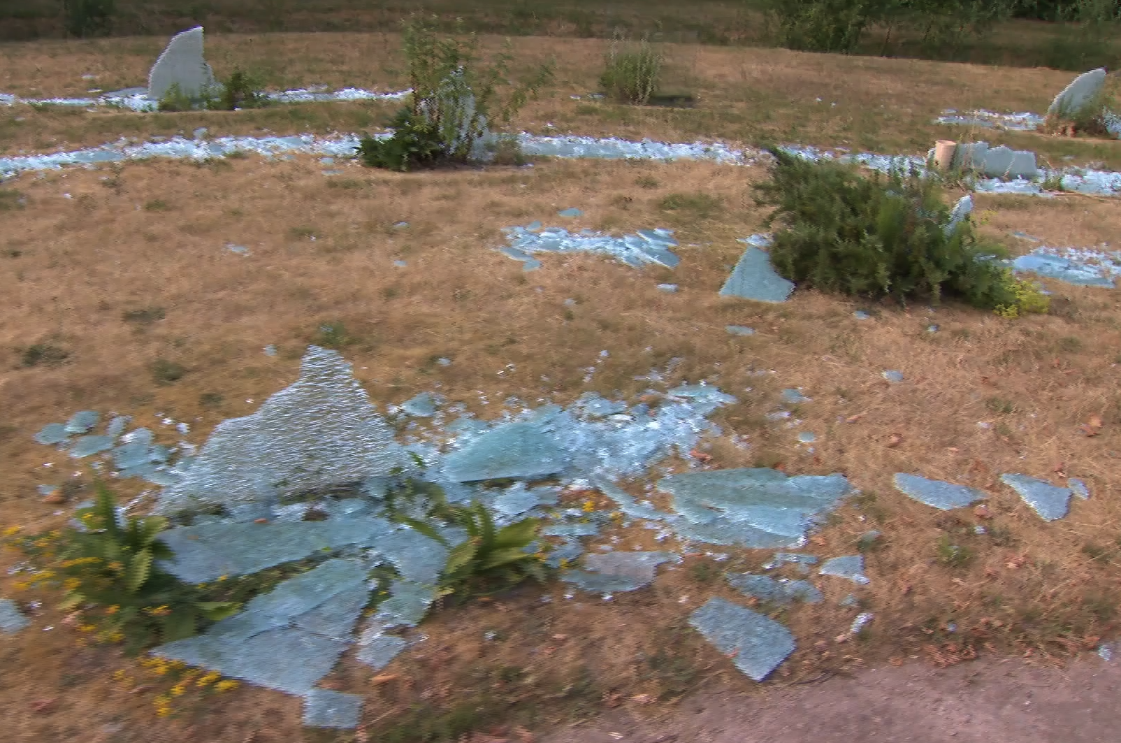 67 glaspanelen met hamer kapotgeslagen